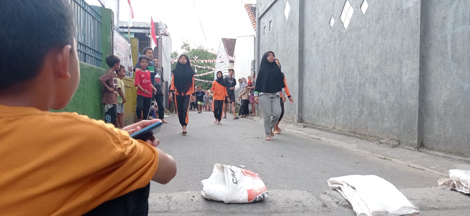 Keterangan Photo: Peserta lomba lari karung saat menggunakan karung.